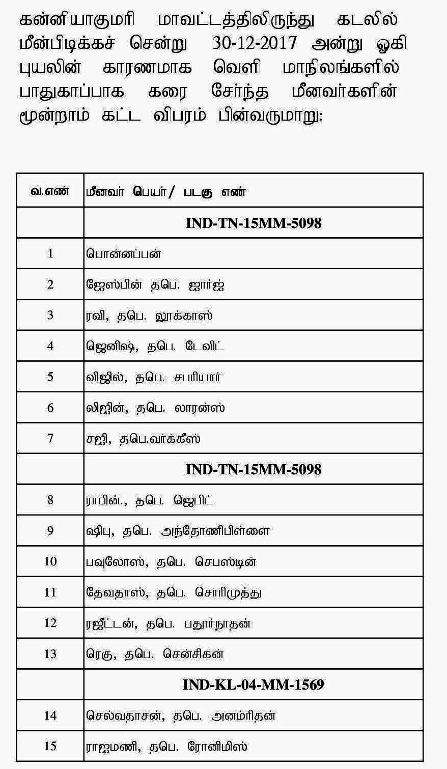 Home|News|ஓகி புயலால் பாதிக்கப்பட்டு பிற மாநிலங்களில் பத்திரமாக மீட்கப்பட்ட தமிழக மீனவர்களின் மூன்றாம் கட்ட பெயர் பட்டியல்! -டாக்டர்.துரைபெஞ்சமின். ullatchithagaval@gmail.com