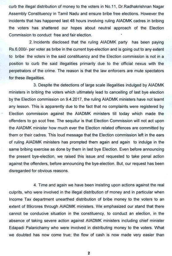 ஆர்.கே.நகரில் நடக்கும் பணப்பட்டுவாடா குறித்து தேர்தல் சிறப்பு அதிகாரி விக்ரம் பத்ராவிடம் மு.க.ஸ்டாலின் இன்று புகார் மனு அளித்துள்ளார்.