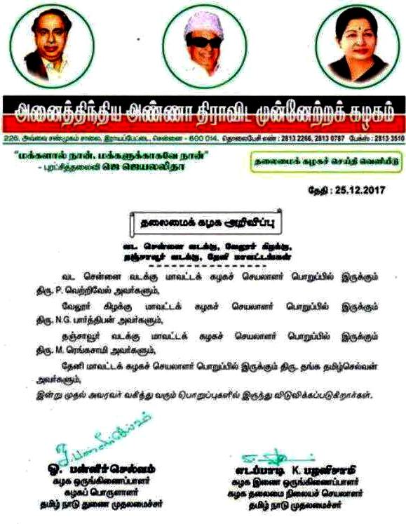 ஆர்.கே.நகர் இடைத்தேர்தலில் அதிமுக தோல்வி! -டிடிவி தினகரன் ஆதரவாளர்கள் அதிமுகவில் இருந்து நீக்கம்.