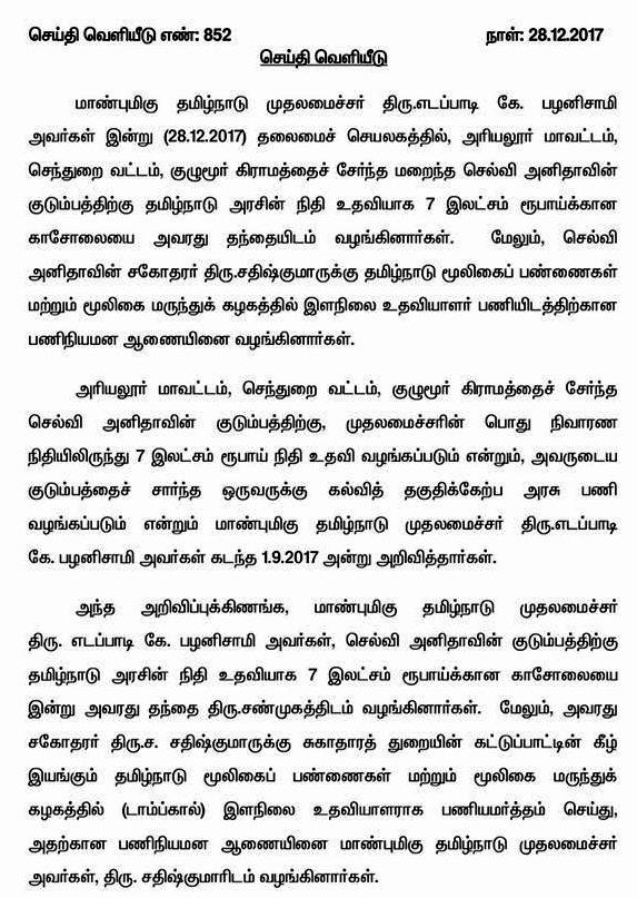 நீட் தேர்வு விவகாரத்தில் தற்கொலை செய்து கொண்ட அனிதாவின் குடும்பத்திற்கு ரூ.7 இலட்சம் நிதி உதவி; அவரது சகோதரருக்கு அரசு பணி!