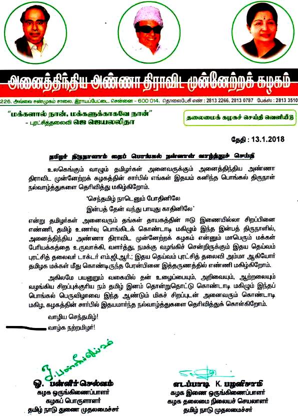 தமிழ்நாட்டு மக்கள் அனைத்து நலன்களையும், வளங்களையும் பெற்று சீரோடும், சிறப்போடும் வாழ்ந்திட வேண்டும்: முதலமைச்சர் கே. பழனிசாமி பொங்கல் திருநாள் வாழ்த்து!