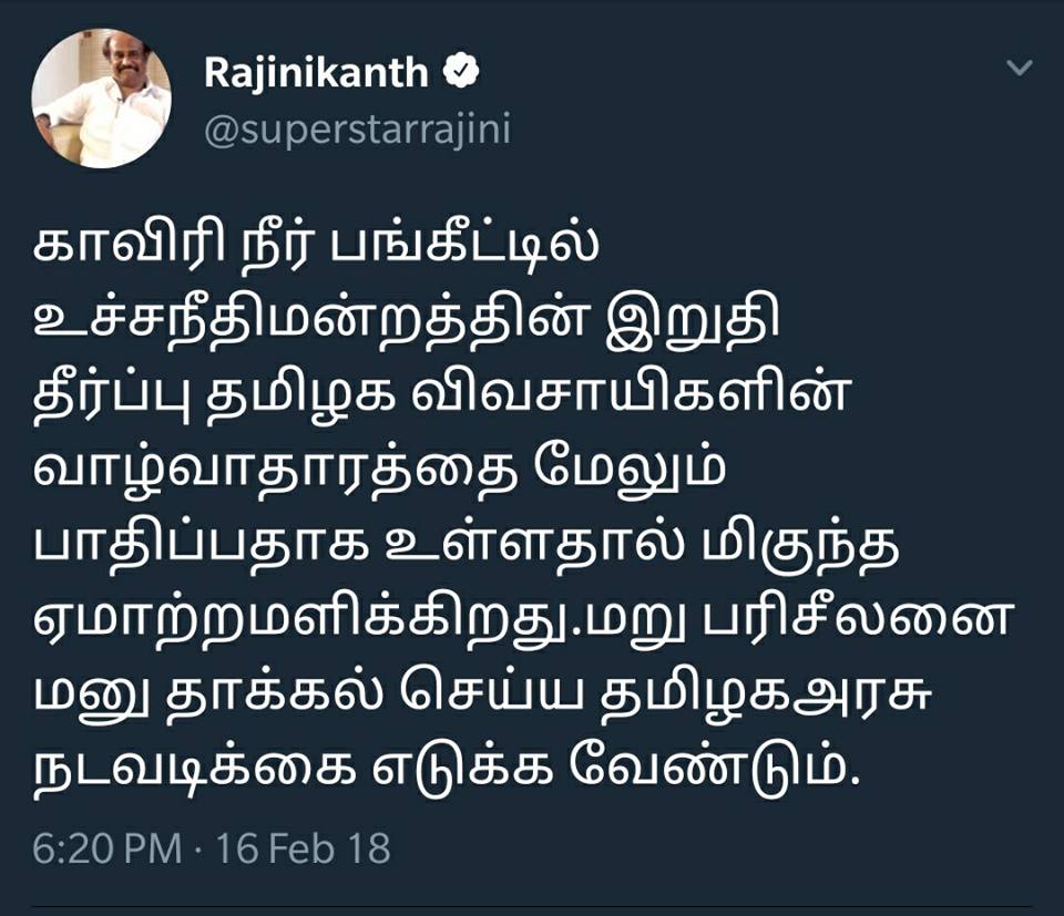 Home|News|தமிழ்நாடு|காவிரி நதி நீர் பங்கீட்டில் சுப்ரீம் கோர்ட்டின் தீர்ப்பு மிகுந்த ஏமாற்றமளிக்கிறது: நடிகர் ரஜினி காந்த் கருத்து. -கே.பி.சுகுமார். Leave a Reply Cancel reply Save my name, email, and website in this browser for the next time I comment.